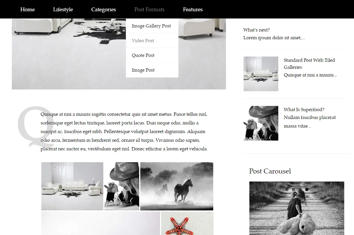 - 8 Post Formats – Post formats support & styling: Standard, Image, Image Gallery, Quote, Link, Aside, Video and Audio